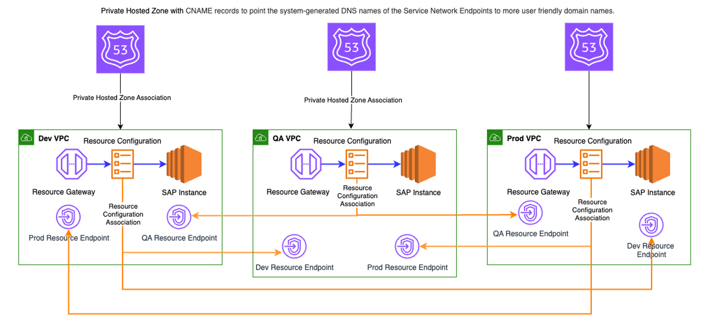 - Create and associate separate Private Hosted Zones with SAP dev, prod, QA environment VPC and Ingress VPC. Create CNAME records to point the system-generated DNS names of the Service Network Endpoints in each VPC to a more user friendly domain names.