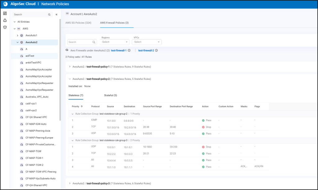 The following screenshot shows the Network Policies page on the AlgoSec Cloud console. The main account page shows the firewalls, the policy sets, and the rules.