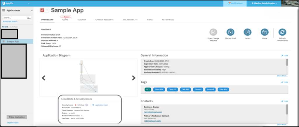 The AWS firewall details are associated with the relevant business applications and are part of the application view from AlgoSec Horizon that displays details about each application. This includes the application owners, an application diagram, and other related policies and connections across on-premises and cloud resources that are required. This view is shown in the following screenshot.