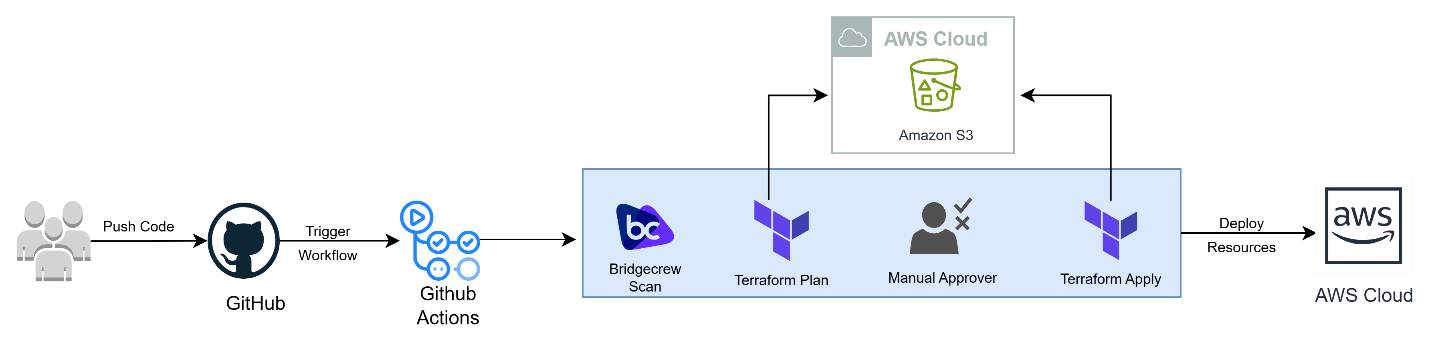 When developers commit infrastructure code to GitHub, an automated CI/CD workflow is triggered. The pipeline runs a Bridgecrew security scan to identify misconfigurations and executes a Terraform plan to preview changes. After manual approval, the pipeline runs Terraform apply to provision AWS infrastructure. Terraform state files are stored in Amazon S3 with state locking for consistency and collaboration.