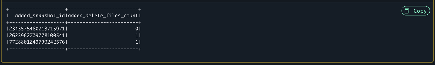 This query will result in three records returned, as shown in the following screenshot. The added_delete_files_count for the first snapshot that inserts records should be 0. The next two snapshots for the corresponding delete and update statements should have 1 each for added_delete_files_count value.