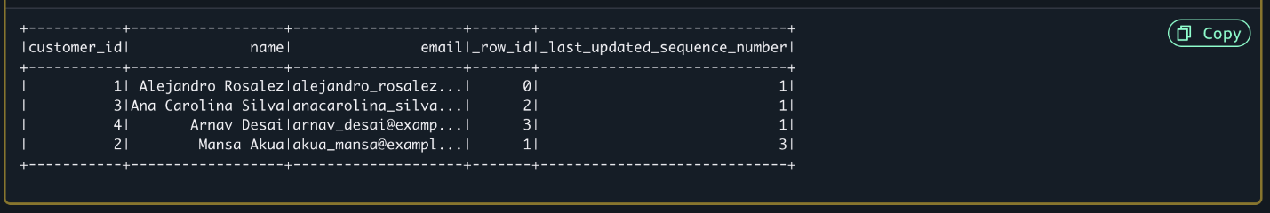Running this query after the previous insert, update, and delete statements returns four records, as shown in the following screenshot. The deleted record is removed. The _last_updated_sequence_number is 3 for the update to customer_id = 2.