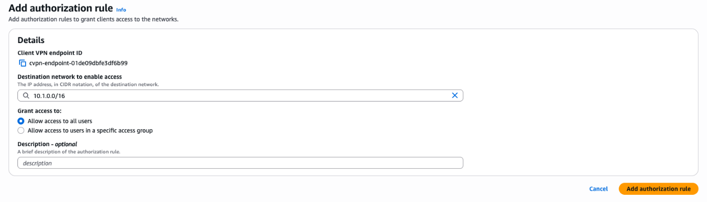 During the initial setup of the Client VPN endpoint, you defined authorization rules that authorized the VPN_users group to access the VPN-VPC network, which is 10.0.0.0/16.Complete the following steps to add connectivity to database-VPC:
