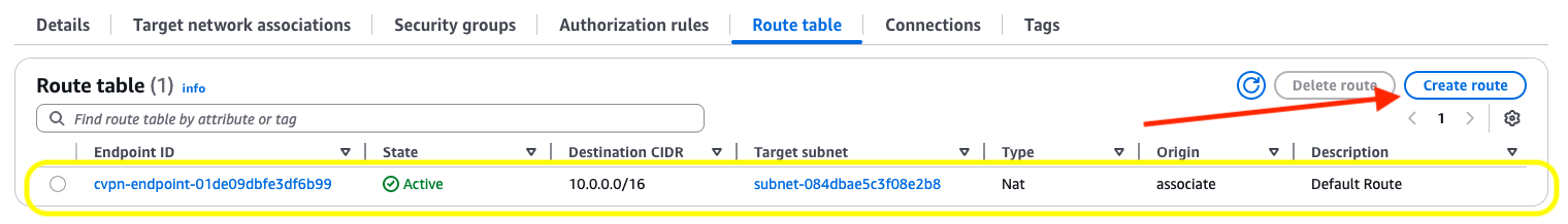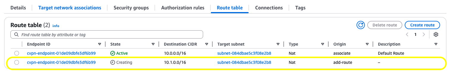 After you create the authorization rule, the user now has access to that CIDR range. Next, you add an entry in the Client VPN endpoint’s route table to provide reachability from a network perspective.