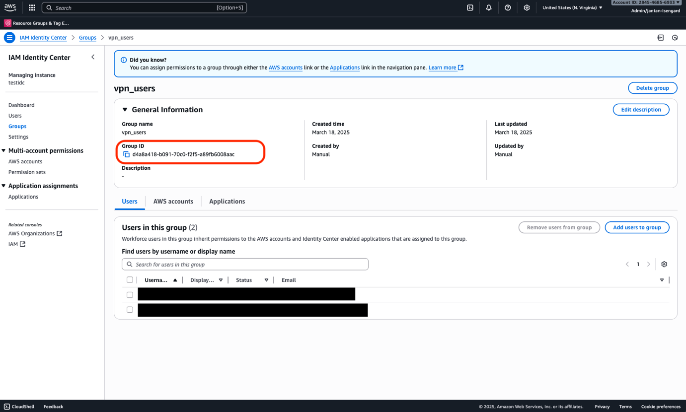 - Choose Create group and create a group (for this example, we name the group vpn_users.