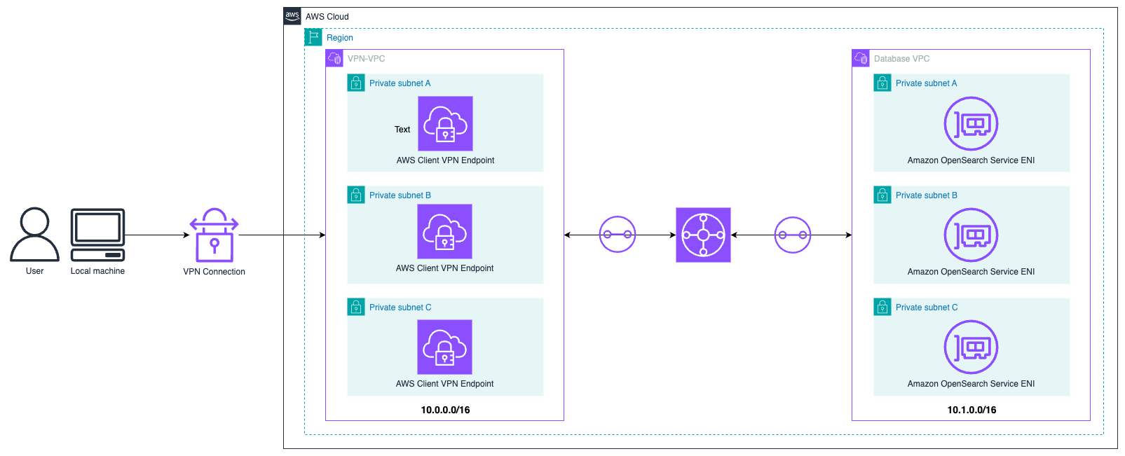 - For VPN-VPC, add routes on the subnets where the Client VPN endpoints are attached. The route is 10.1.0.0/16 using Transit Gateway. This route allows VPN users to reach Database-VPC.