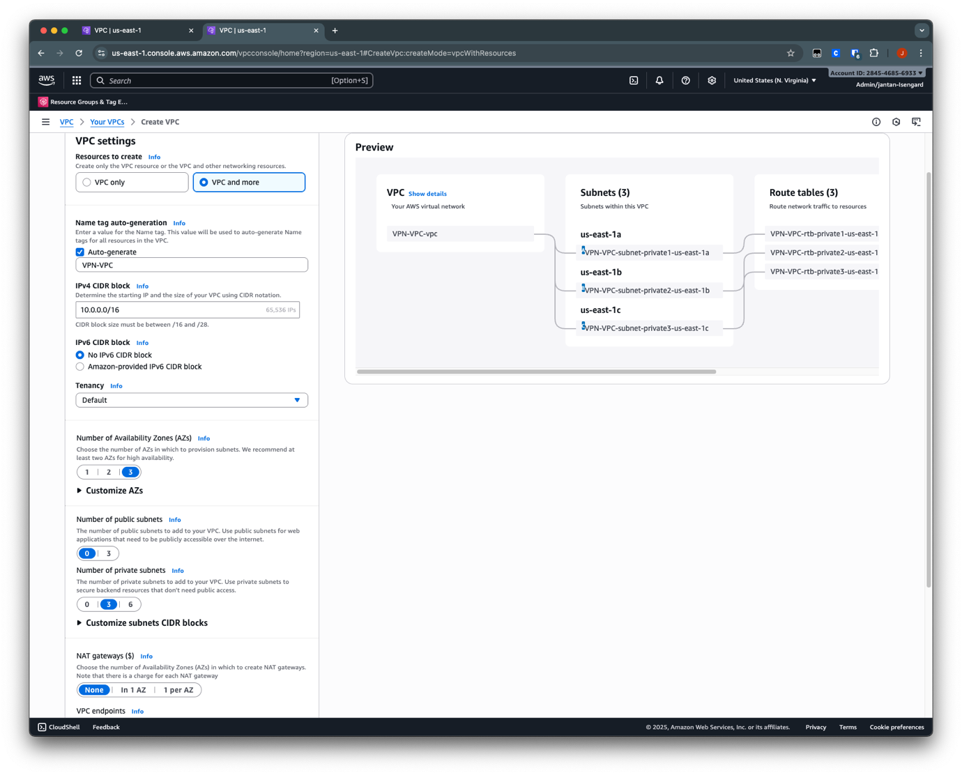 - Choose 3 for the number of private subnets.