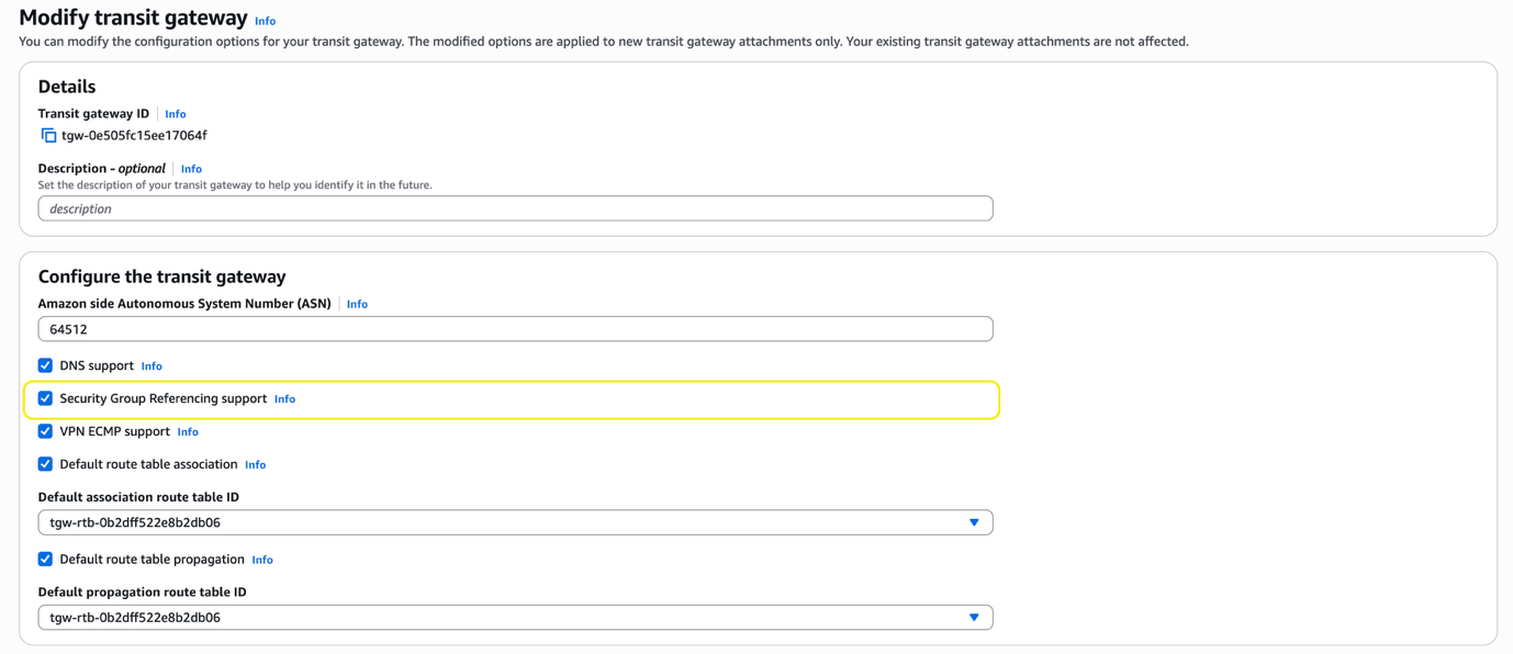 - Select Security Group Referencing support and choose Modify transit gateway.