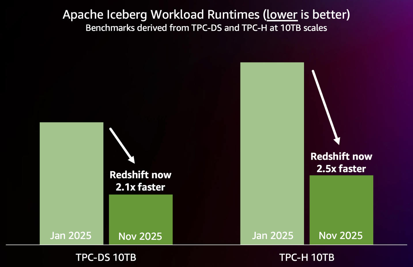 With the growing adoption of open table formats like Apache Iceberg, Amazon Redshift continues to advance its capabilities for open format data lakes. In 2025, Amazon Redshift delivered several performance optimizations that improved query performance over twofold for Iceberg workloads on Amazon Redshift Serverless, delivering exceptional performance and cost-effectiveness for your data lake workloads.