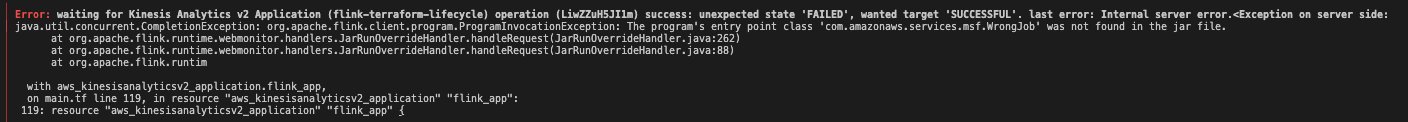 Error: waiting for Kinesis Analytics v2 Application (flink-terraform-lifecycle) operation (*) success: unexpected state ‘FAILED’, wanted target ‘SUCCESSFUL’. last error: org.apache.flink.runtime.rest.handler.RestHandlerException: Could not execute application.