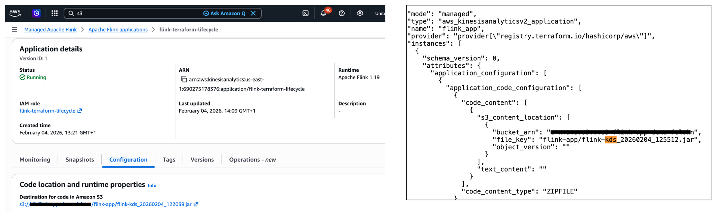 When you perform the explicit rollback, Terraform will initially not be aware of the changes. More specifically, the S3 path to the JAR file in the Managed Service for Apache Flink service (see left part of the image below) is different to the S3 path denoted in the terraform.tfstate file stored in Amazon S3 (see the right part of the image below). Fortunately, Terraform will always perform refreshing actions that include reading the current settings from all managed remote objects and updating the Terraform state to match as part of creating a plan in both terraform plan and terraform apply commands.