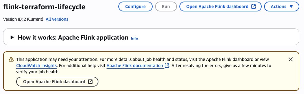 Terraform provides the start_application parameter, indicating whether to start or stop the application. You can set this parameter using flink_app_start in config.tfvars.json to stop your running Apache Flink application. However, this will only work if the current configuration value is set to true. In other words, Terraform only responds to the change in the parameter value, not the absolute value itself. After Terraform applies this change, your Apache Flink application will stop and its application status will move to READY. Similarly, restarting the application requires changing the flink_app_start value back to true, but this will only take effect if the current configuration value is false. Terraform will then restart your application, moving it back to the RUNNING state.
