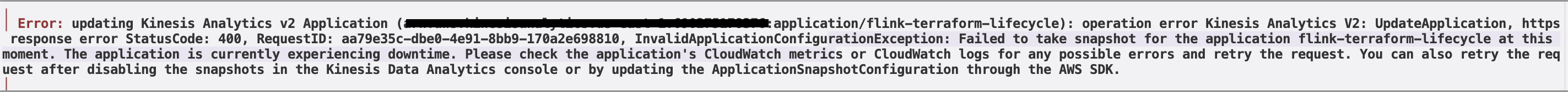 Reverting the changes made to the environment variable and deploying the changes will result in Terraform showing the following error message: Failed to take snapshot for the application flink-terraform-lifecycle at this moment. The application is currently experiencing downtime.