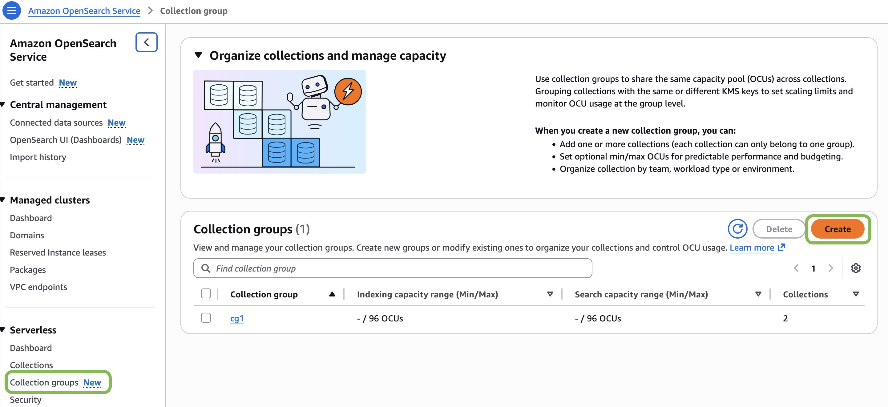 To dive deeper into the collection groups and minimum OCU configuration, visit the Amazon OpenSearch Serverless documentation.
