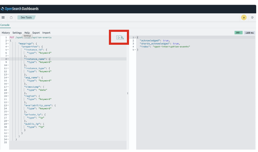 - On the dev tools console, paste the following PUT command and execute the request by choosing ‘Click to send request’.