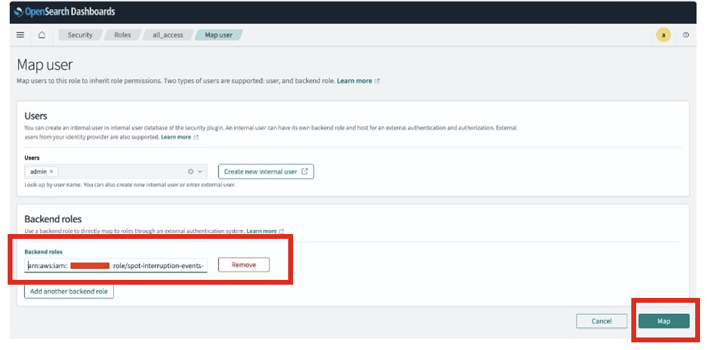 - In the ‘Backend roles’ add the Lambda execution role ARN copied earlier and Choose ‘Map’