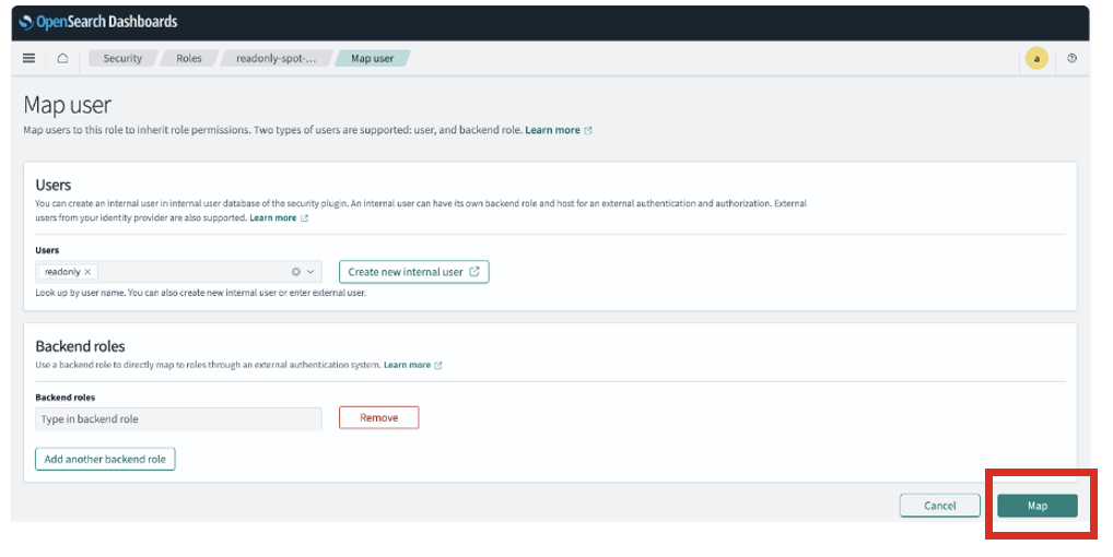 In this section you will create a new user and a role with read-only access, then assign the role to the user to grant them read-only access to the Spot Interruption dashboard and visualizations.