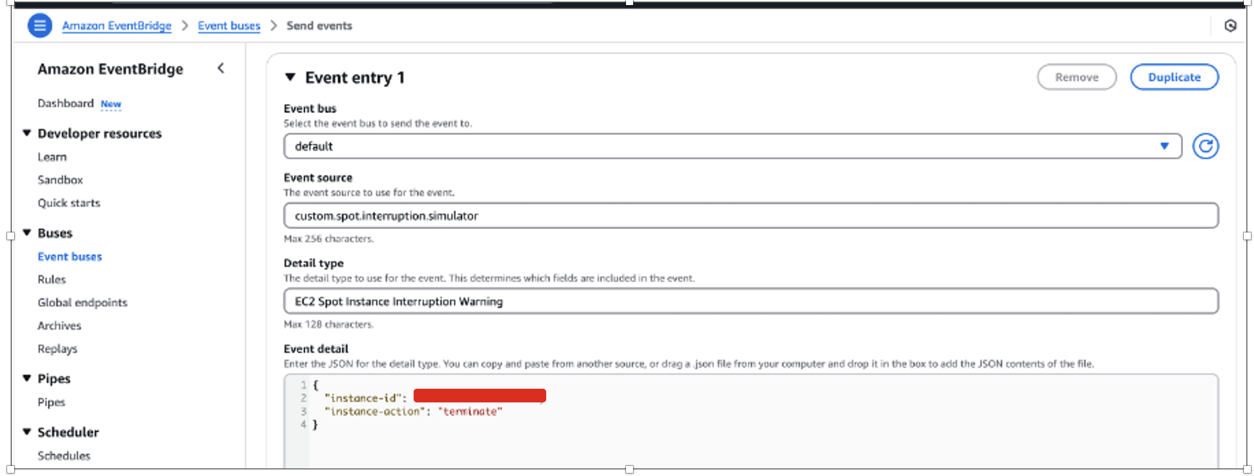 A temporary event rule was created during deployment to simulate matching Amazon EC2 Spot interruption notices. The rule name is the name you specified during deployment for the CustomEventRuleName parameter.