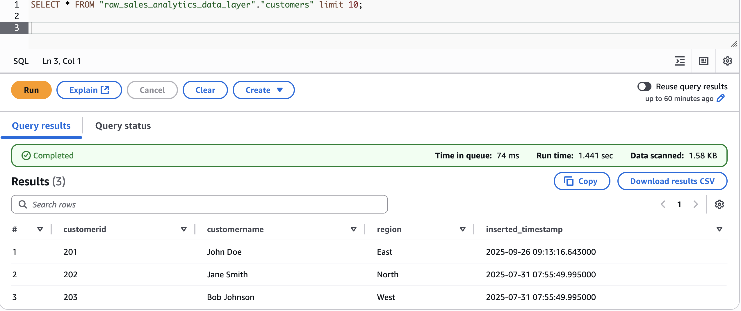 In this step, we create a dedicated database for our raw data and set up tables for customers, products, and sales using Amazon Athena. These tables are configured to use the Iceberg table format and are compressed using the ZSTD algorithm to optimize storage. The LOCATION property specifies where the data will be stored in Amazon S3 so that data is organized and accessible.