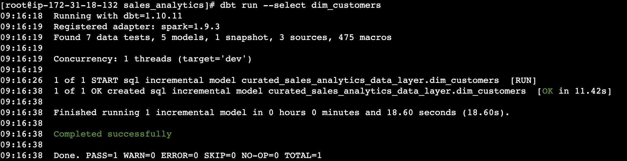 For routine pipeline runs, incremental updates process only new or changed data, significantly reducing compute time and cost. The following command targets specific models (
