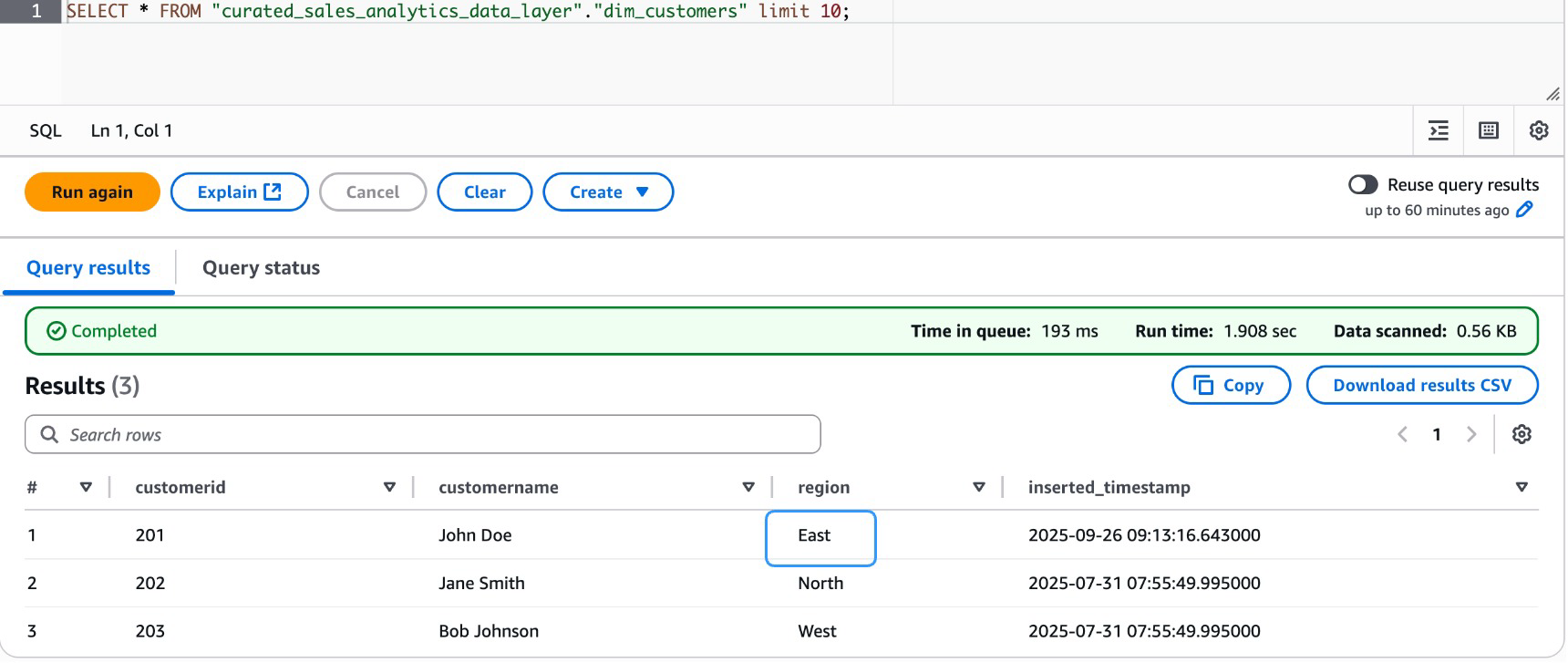 Now, modify the raw layer data for customerid 201 and change the Region to East