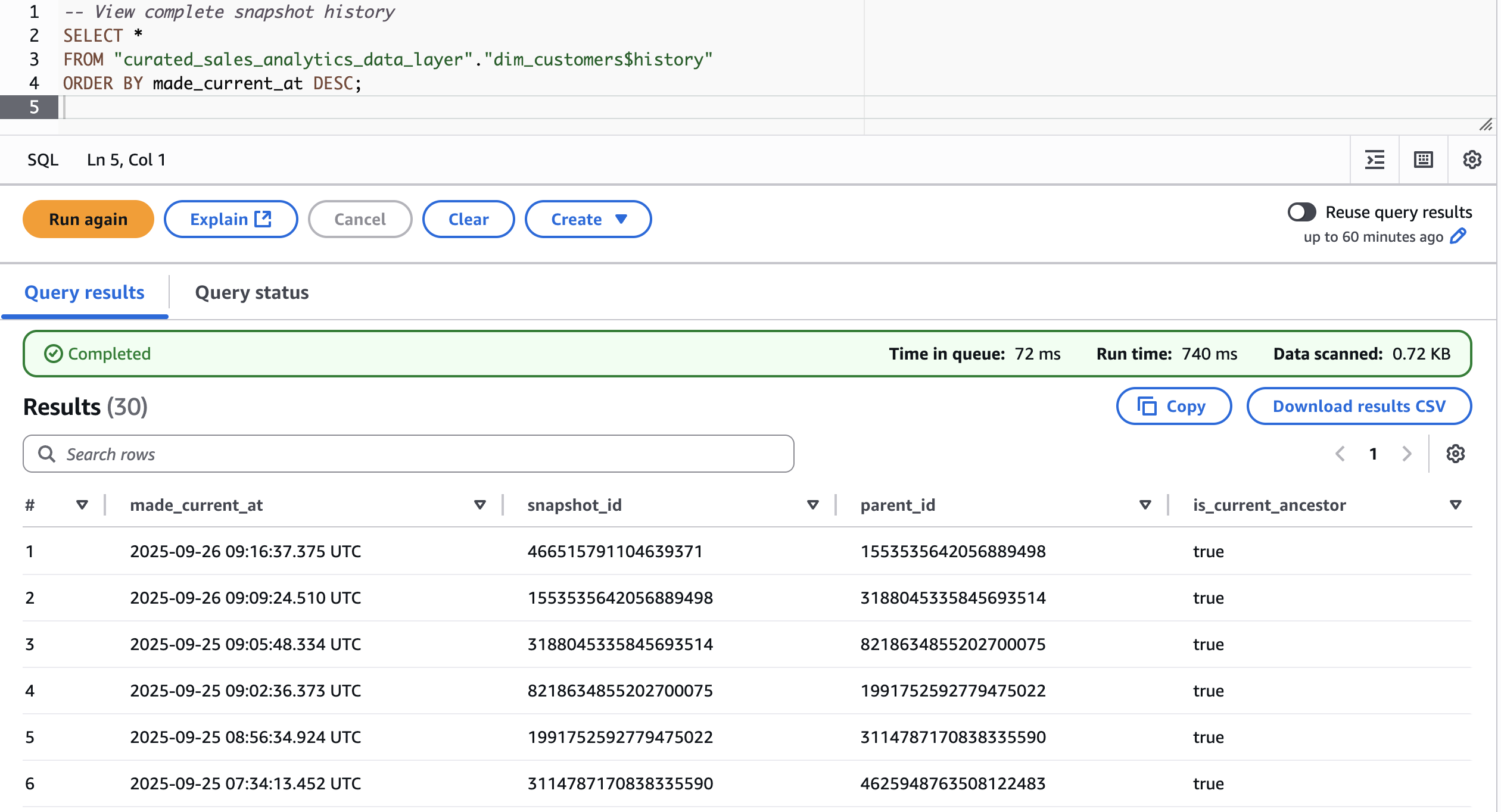First, let’s fetch snapshots for customers dimension table in curated layer