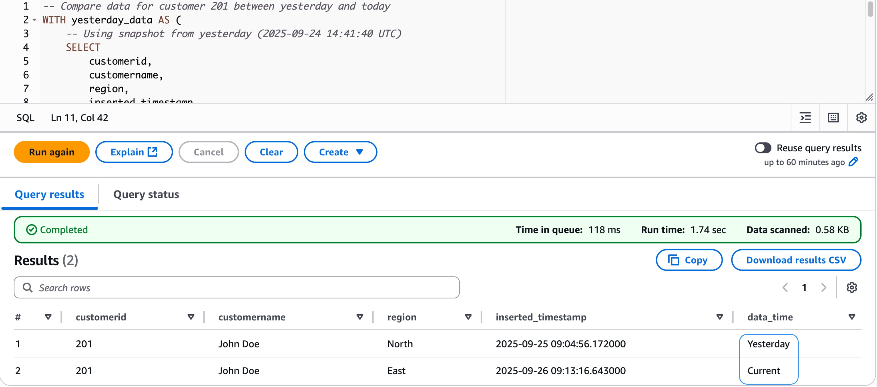 This section demonstrates how to use Apache Iceberg’s time travel capabilities and transactional operations using actual snapshot data from our dim_customers table. We walk through querying data at different points in time and comparing changes between snapshots.