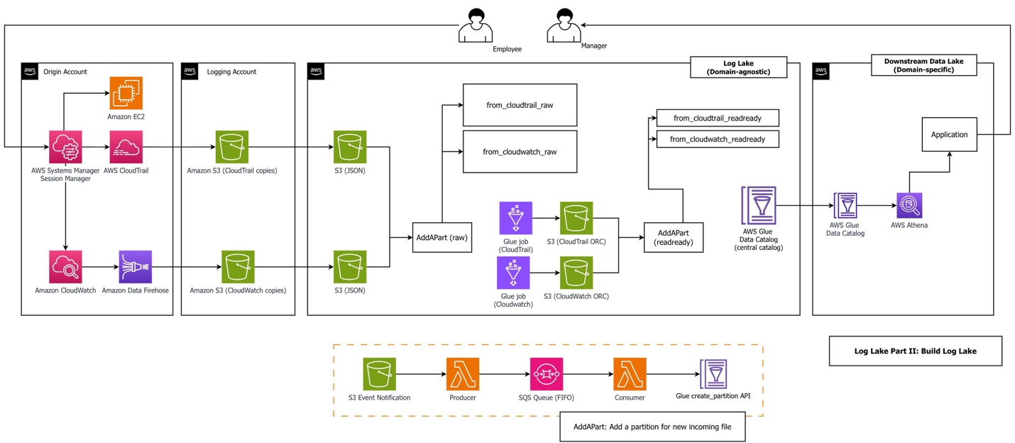 Log Lake is not just for Session Manager, but also general purpose CloudTrail and CloudWatch logs. After adding CloudWatch and CloudTrail logs to raw tables at scale, you can set up AWS Glue jobs to process the many tiny JSON files of raw tables into bigger binary files for “readready” tables. Then, these readready tables could be queried with different filters to answer questions for many use cases, such as legal or regulatory reviews for compliance, deep forensic investigations for security, or auditing. Log Lake is an answer to the question “Are there logs, and if so, how do I get them?”