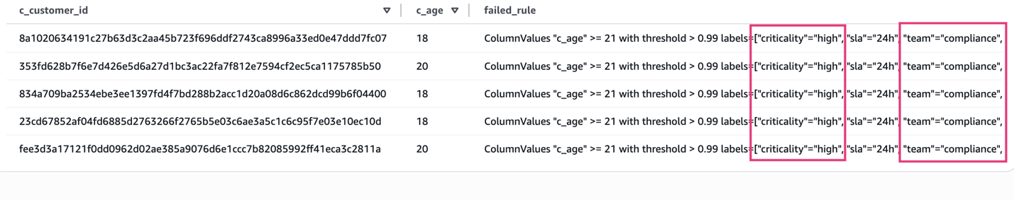 With labels stored alongside row-level outcome, you can query specific records that failed data quality checks based on label criteria. For example, the following query identifies individual customer records that failed high criticality compliance rules. You can use it to quickly locate and remediate problematic data for regulatory or business-critical use cases: