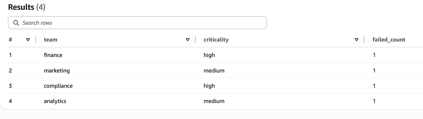 Now that we have stored rule-level outcomes with labels, we can run aggregation queries to analyze failures across different dimensions. For example, the following query groups failed rules by criticality and team to identify which teams have the most high-severity failures. You can use it to prioritize remediation efforts and allocate resources effectively: