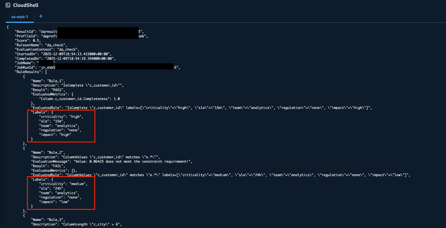 The output includes a Labels object for each rule in the RuleResults array, containing the label key-value pairs you defined. This provides programmatic access to the same labeled data quality results, which can be useful for automation and scripting workflows.