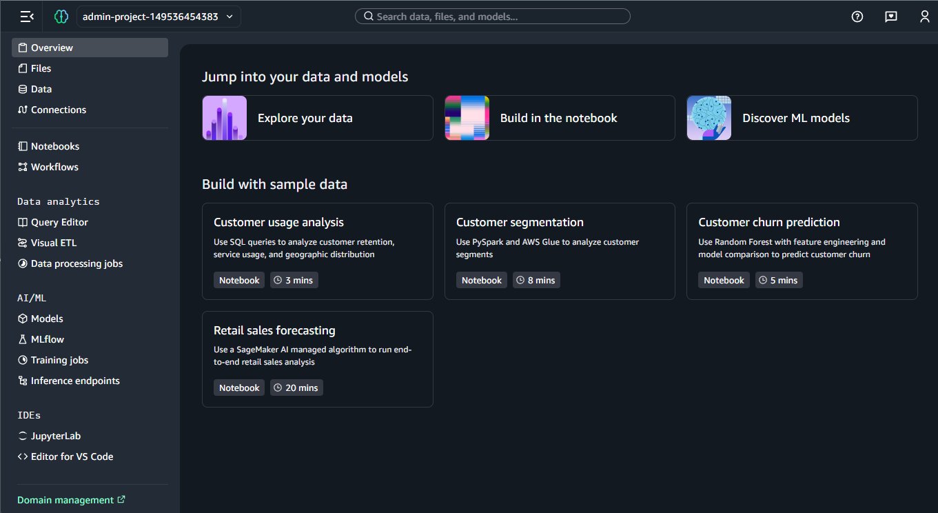 Get started exploring your data with one-click onboarding that provisions and configures environments in minutes instead of weeks. The new onboarding experience can reuse existing AWS Identity and Access Management (IAM) roles to provide access to SageMaker Unified Studio, automatically connecting to data sources across S3 buckets, S3 Tables, AWS Glue Data Catalog, and AWS Lake Formation policies, removing the need for additional data permission setup. Under the covers, a new IAM-based domain and project are created with default notebook and compute resources preconfigured. When complete, you enter SageMaker Unified Studio with all your tools available in the left-side navigation along with built-in samples to accelerate first use, as seen in the following screenshot.
