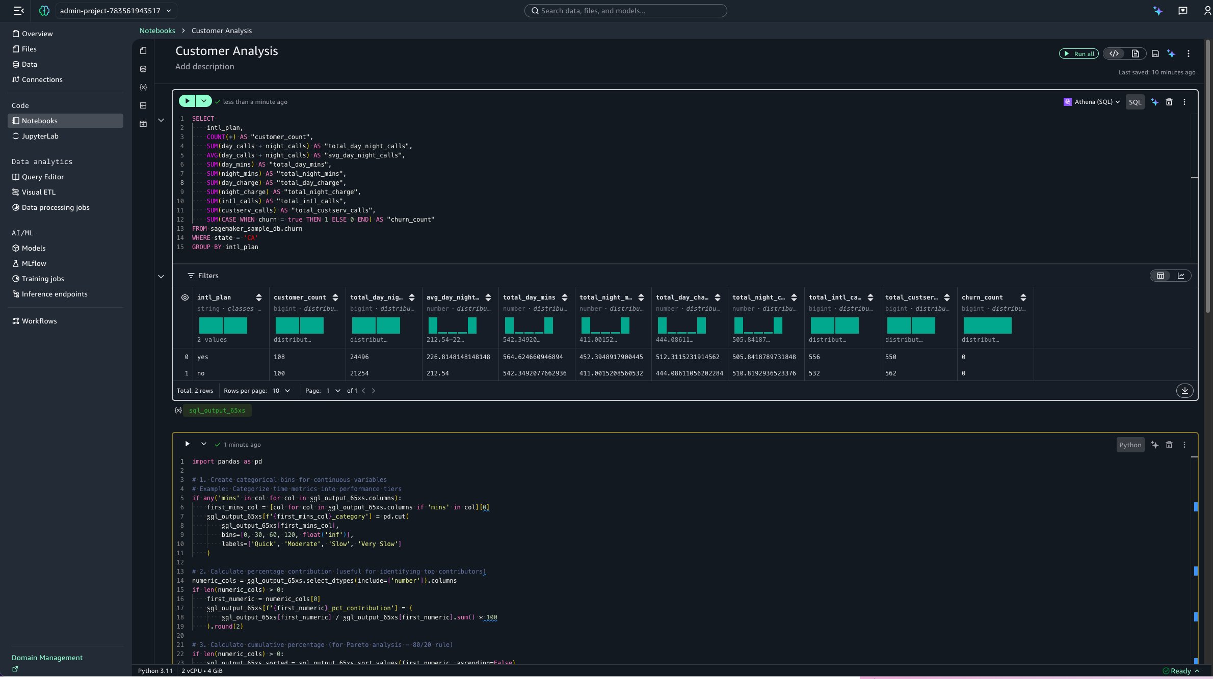 The fully managed, web-based notebooks in SageMaker Unified Studio support multiple programming languages, letting you write Python, SQL, and Spark code in the same notebook. The infrastructure adjusts automatically based on your workload, while built-in libraries create charts and insights directly in your workflow. When your analysis scales beyond interactive queries to large-scale data processing, Amazon Athena for Apache Spark engine delivers optimized performance, integrating with the serverless notebook experience to execute analytical workloads efficiently. This serverless approach eliminates the need to provision clusters or maintain servers, reducing the time from question to insight.
