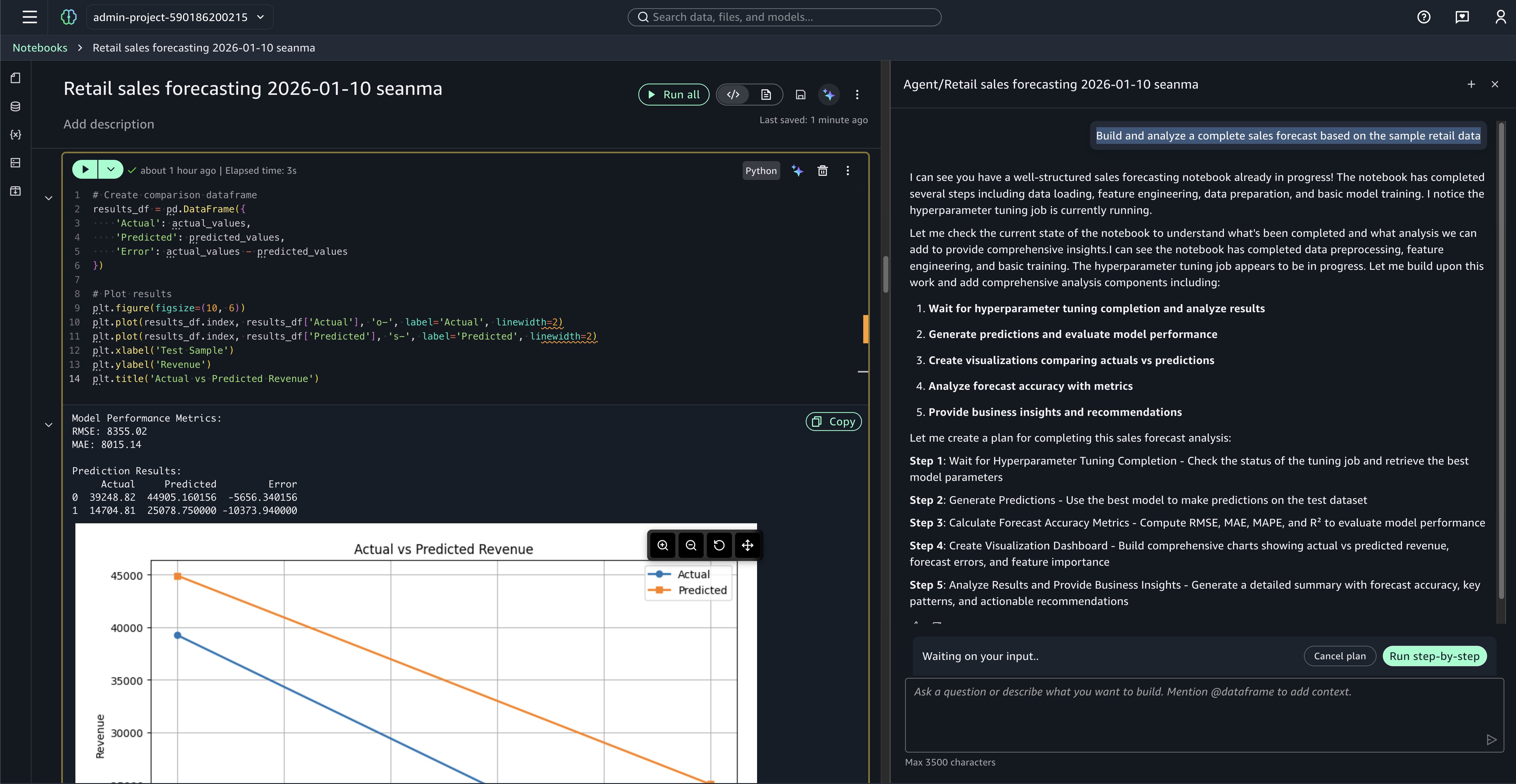 In the preceding example image, if you prompt Build and analyze a complete sales forecast based on the sample retail data, the agent helps identify the relevant tables and suggests the appropriate joins and analysis approach, transforming what might take hours into minutes. To try this yourself, navigate to the Overview tab in your SageMaker Studio environment and look for the Retail Sales Forecasting with SageMaker XGBoost notebook in the sample notebooks collection—these examples are automatically available when you first set up SageMaker Studio. The agent breaks down complex analytical workflows into manageable, executable steps, so you can move from question to insight faster.