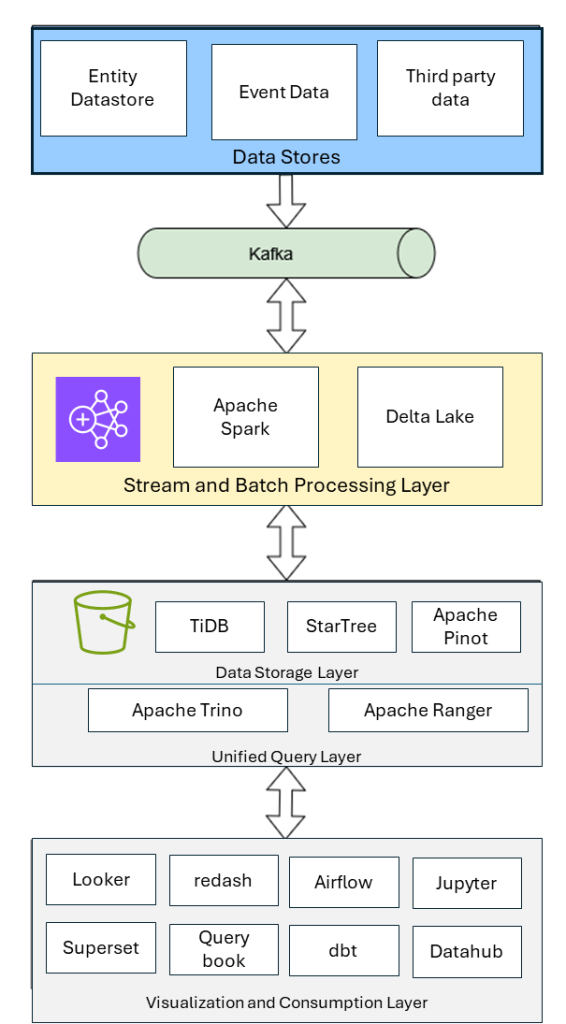 Razorpay implemented a comprehensive data service migration to Amazon EMR using a phased approach. The solution architecture as shown in the following diagram comprises multiple layers handling data ingestion, processing, and consumption.
