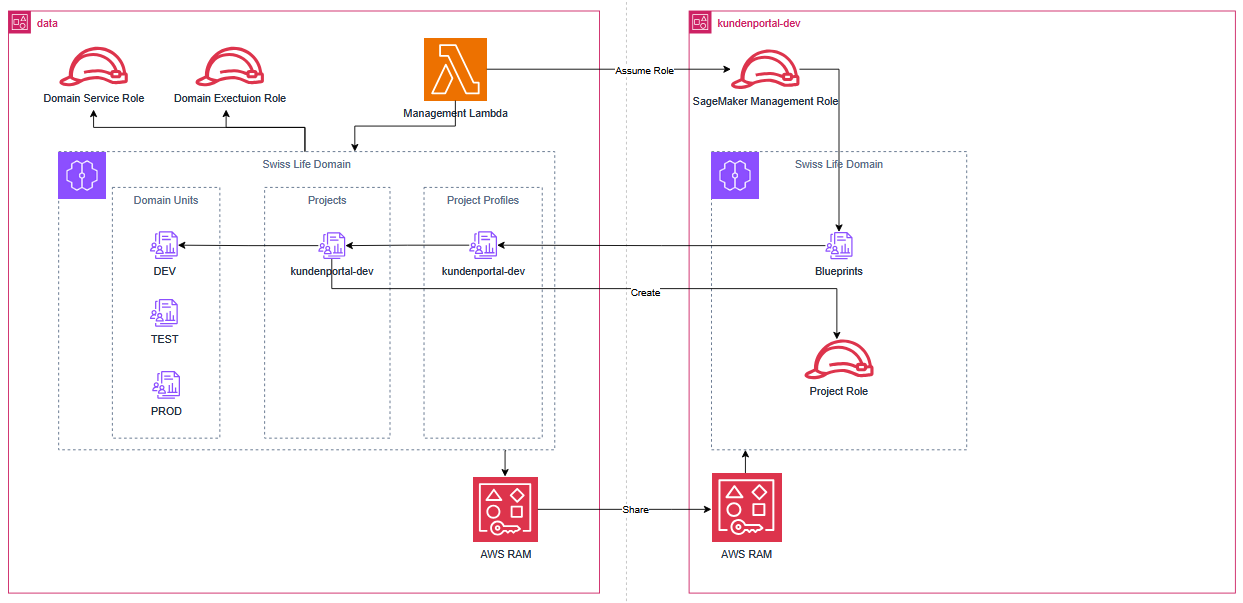 Given this diverse set of user groups, the resulting data platform had to support a federated data organization with a centralized governance, decentralized data stores and data-processing organized at the IT System level. This architecture means the SageMaker management account—which orchestrates the data domain—contains no actual data, instead, data and compute resources reside in the individual IT System AWS accounts. Swiss Life’s implementation distinguishes between two fundamental project types: