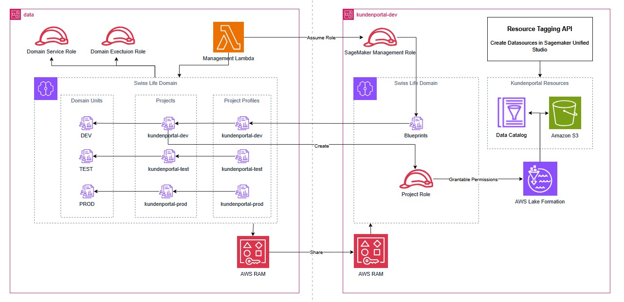 To align with the overarching Swiss Life Germany cloud strategy, the company aimed to build a modern data solution atop their existing AWS data and analytics services. AWS introduced SageMaker to Swiss Life Germany following its announcement at AWS re:Invent 2024. A proof-of-concept quickly validated that this was the right tool to advance Swiss Life’s data journey. By deploying a fully automated framework, Swiss Life Germany sought to create a secure, compliant framework with SageMaker democratizing data access for authorized users, ultimately enabling faster business insights and more responsive customer experiences across the entire data environment.