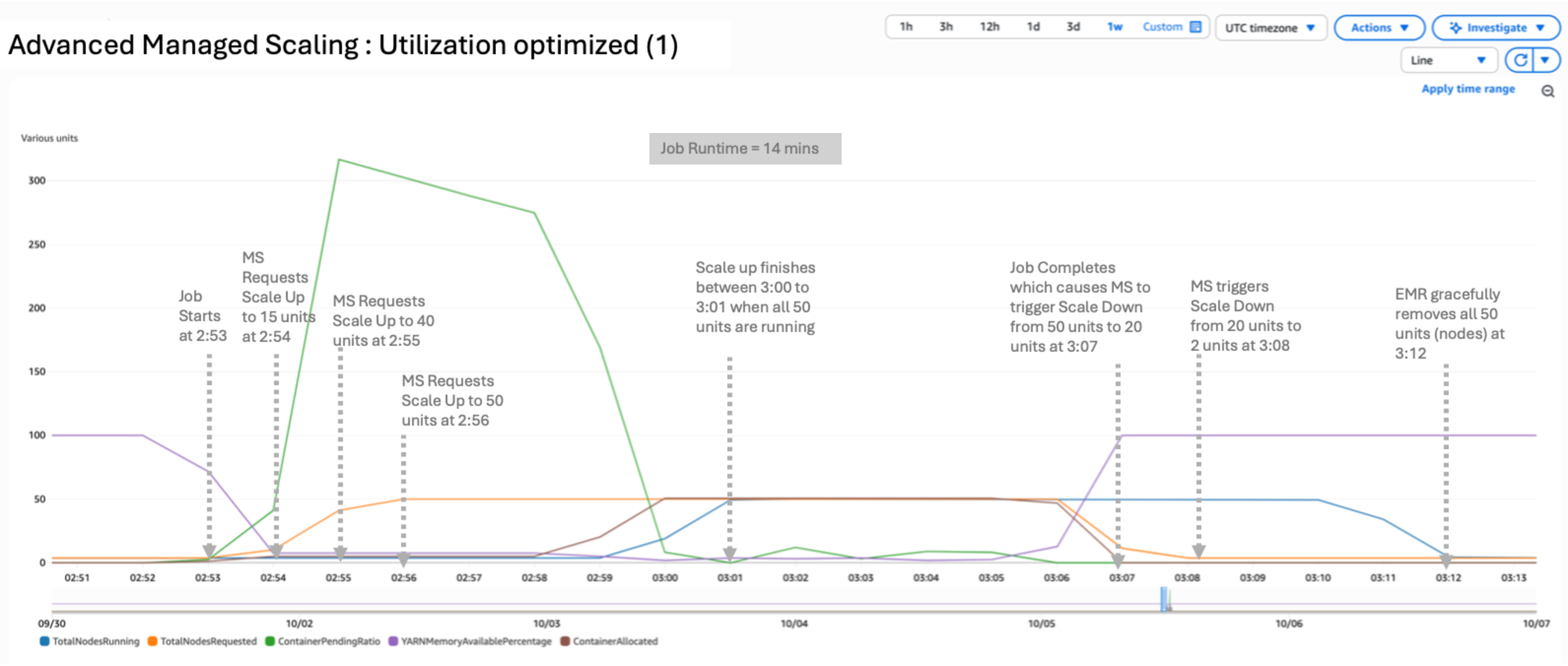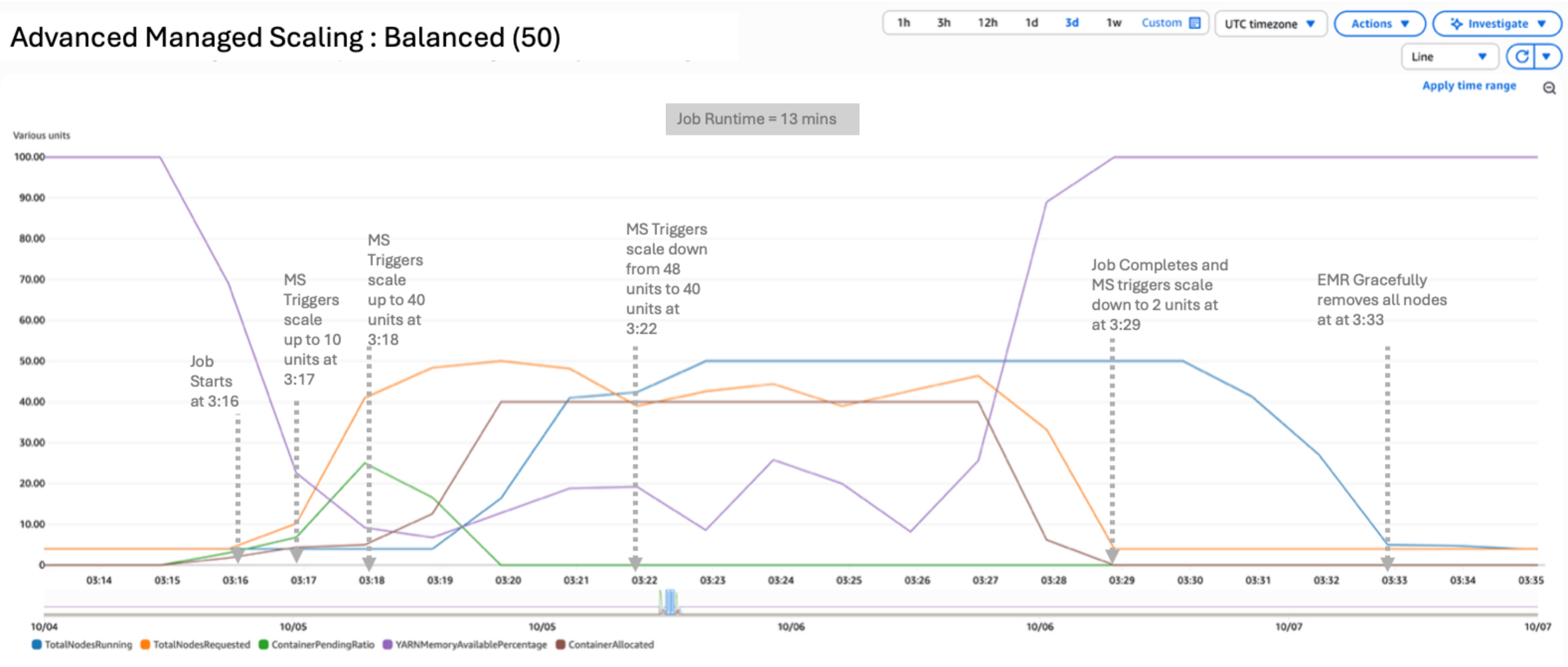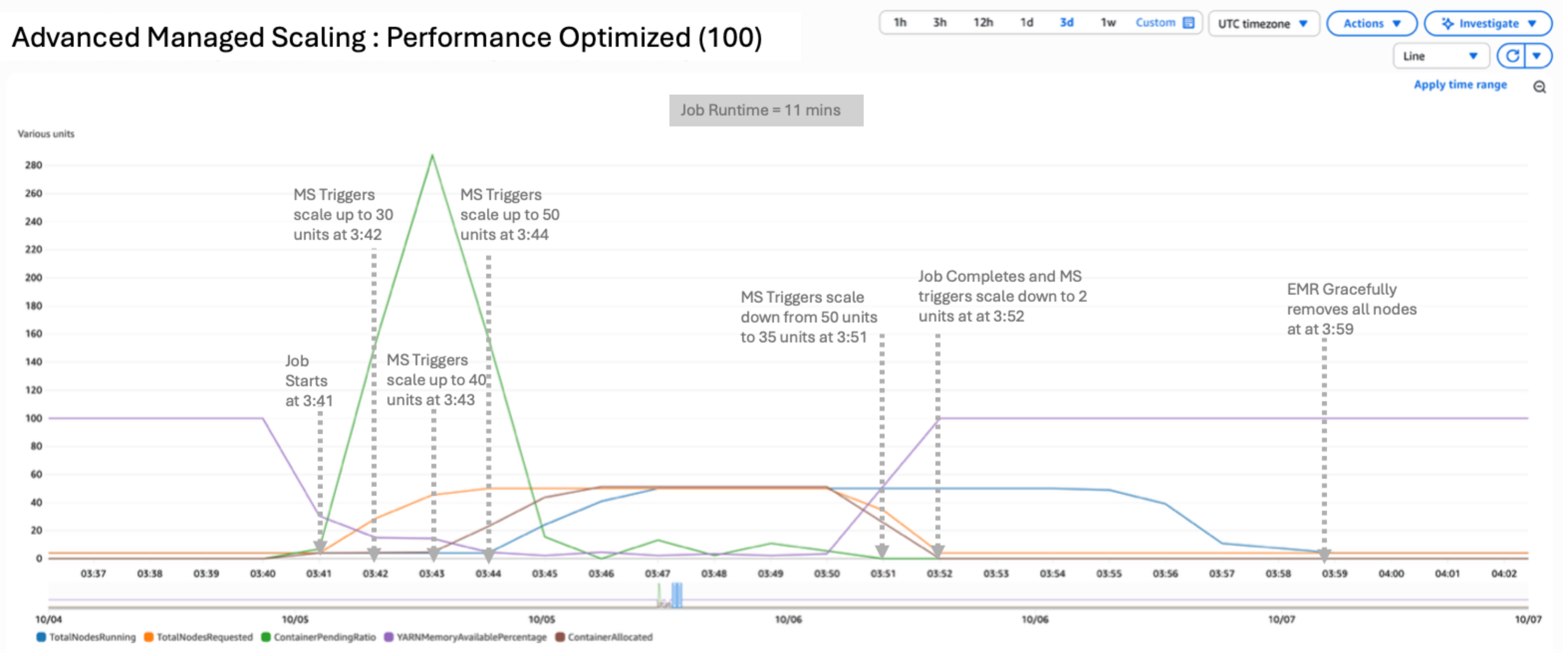 Advanced Managed Scaling in Amazon EMR introduces a more nuanced approach to cluster management through the customized scaling strategies to meet your business requirements. This spectrum offers fine-grained control over how clusters respond to workload demands. At one end, with a utilization optimized configuration of 1, the system prioritizes efficient resource usage, scaling up conservatively to maintain cost-effectiveness and taking advantage of existing cluster resources. In the balanced configuration at 50, the strategy aims to strike an equilibrium between resource utilization and job performance. To meet performance SLAs, the performance optimized value of 100 showed aggressive scaling responding to increased demand for resources quickly, regardless of resource consumption. This granular control helps you fine-tune your cluster’s behavior based on your specific needs, balancing cost, efficiency, and performance.