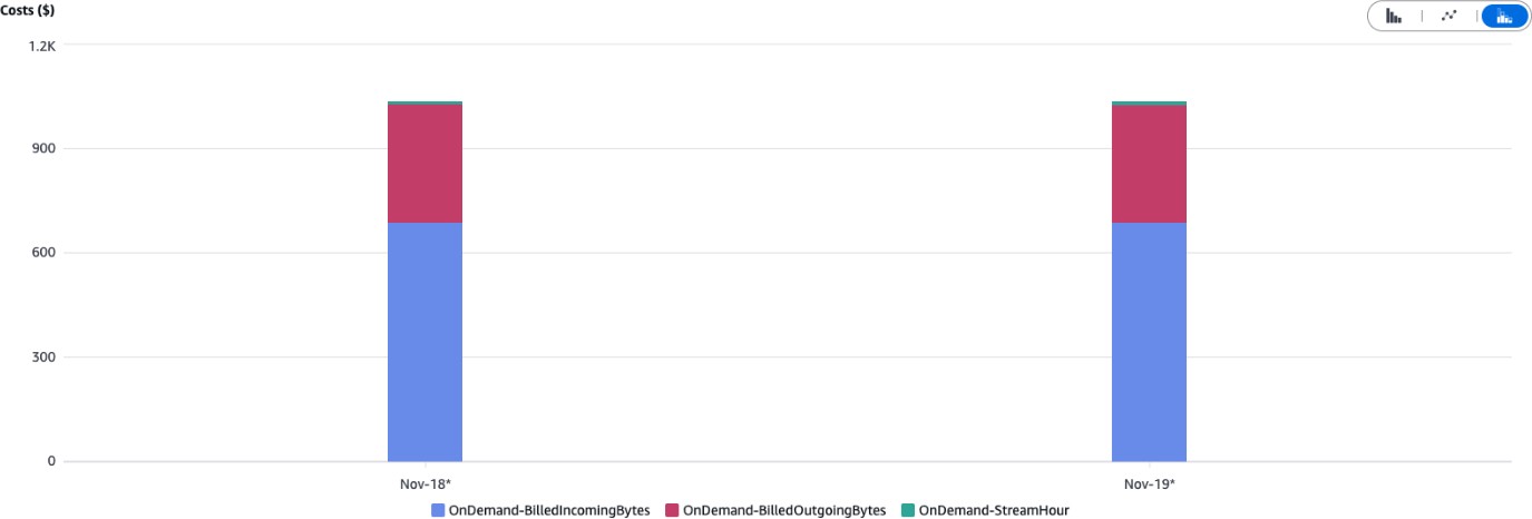 We generated consistent ingest traffic of 15 MiBps distributed across 10 streams for 48 hours to evaluate costs. On-demand Standard Mode: