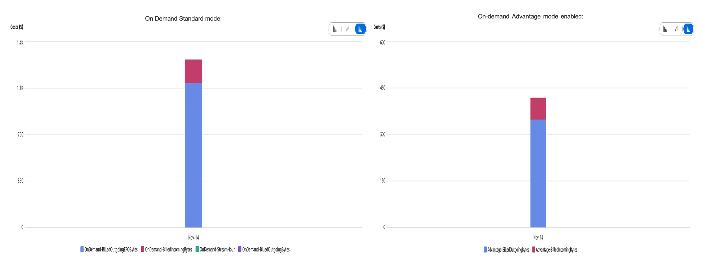 The following charts show the cost difference between On-demand Standard mode vs On-demand Advantage mode enabled: