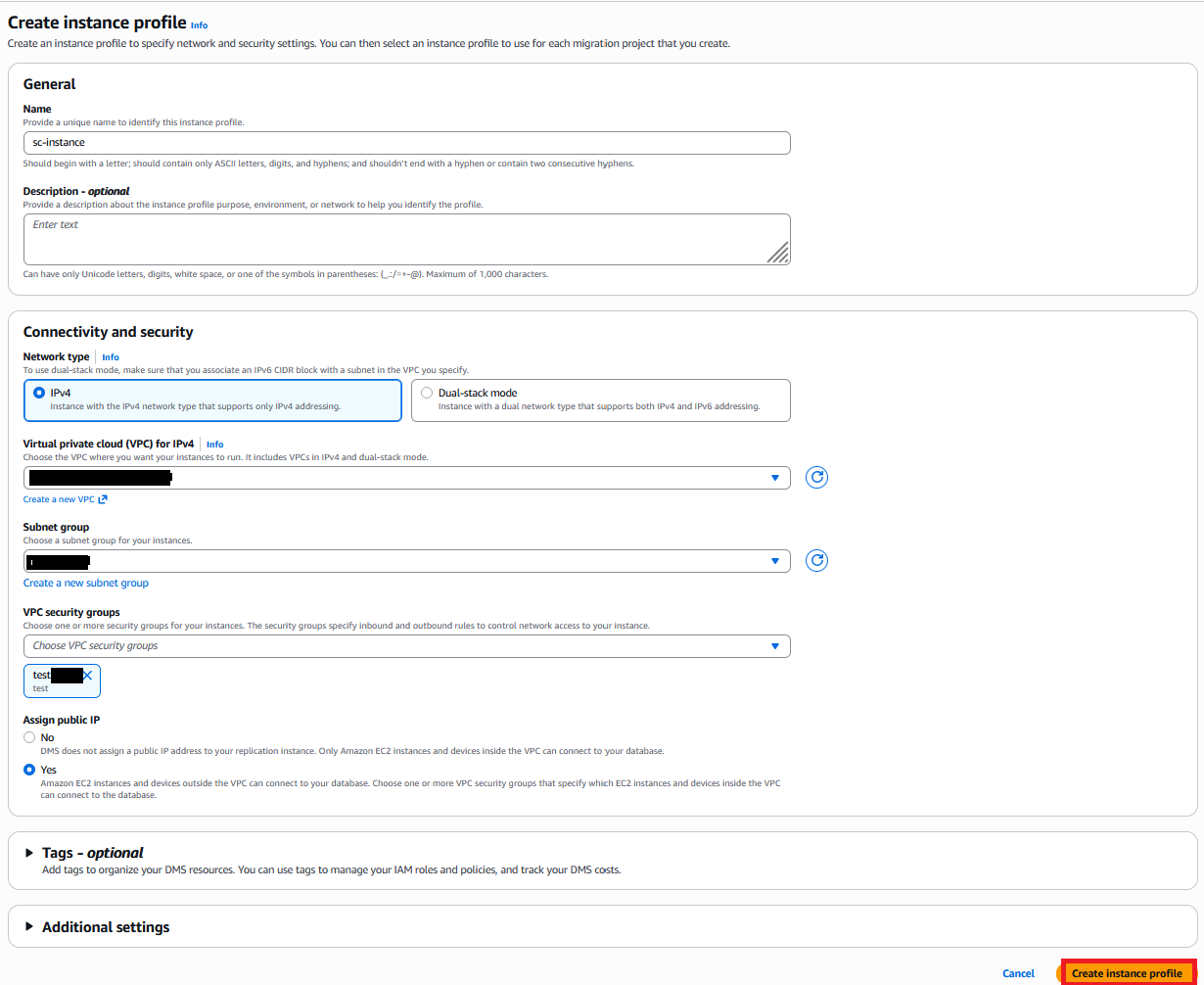 An instance profile specifies the network, security, and Amazon S3 settings for DMS Schema Conversion to use. Create an instance profile with the following steps: