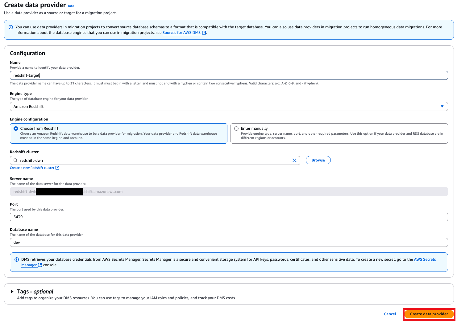 - DMS Schema Conversion and your target Redshift cluster