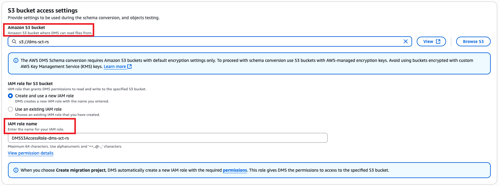 DMS Schema Conversion saves items such as assessment reports, converted SQL code, and information about database schema objects in an S3 bucket. For instructions to create an S3 bucket, refer to Create an S3 bucket.