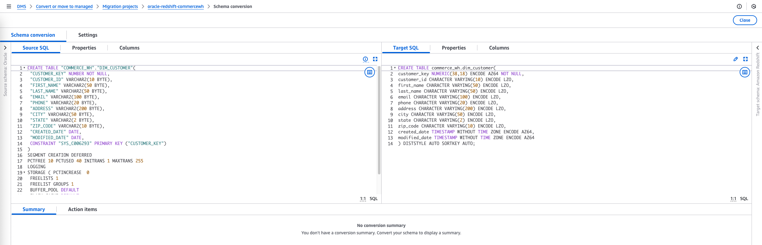 DMS Schema Conversion automatically converts your Oracle database schemas and code objects to Amazon Redshift-compatible formats. This includes tables, views, stored procedures, functions, and data types.