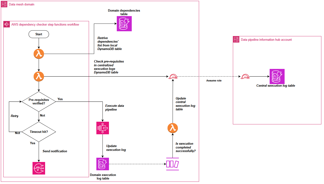 These domains deploy local components such as a dependency-tracking Amazon DynamoDB table and an AWS Step Functions state machine. The state machine checks prerequisites using centralized execution logs and integrates seamlessly as the first step in every SDLF-deployed pipeline, without additional configuration. The following diagram shows the process described.
