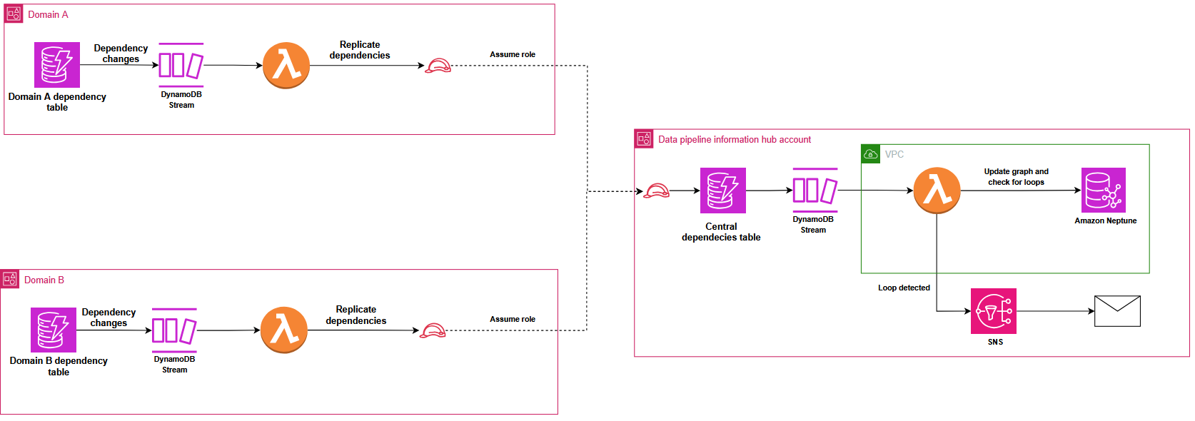 To prevent circular dependencies that could create locks in the distributed orchestration system, Covestro implemented a sophisticated detection mechanism using Amazon Neptune. DynamoDB Streams automatically replicate dependency changes from domain tables to the central registry, triggering an AWS Lambda function that uses the Gremlin graph traversal language (using pygremlin) to construct, update, and analyze a directed acyclic graph (DAG) of the pipeline relationships, with native Gremlin functions detecting circular dependencies and sending automated notifications, as illustrated in the following diagram. This process continuously updates the graph to reflect any new pipeline dependencies or changes across the data mesh.