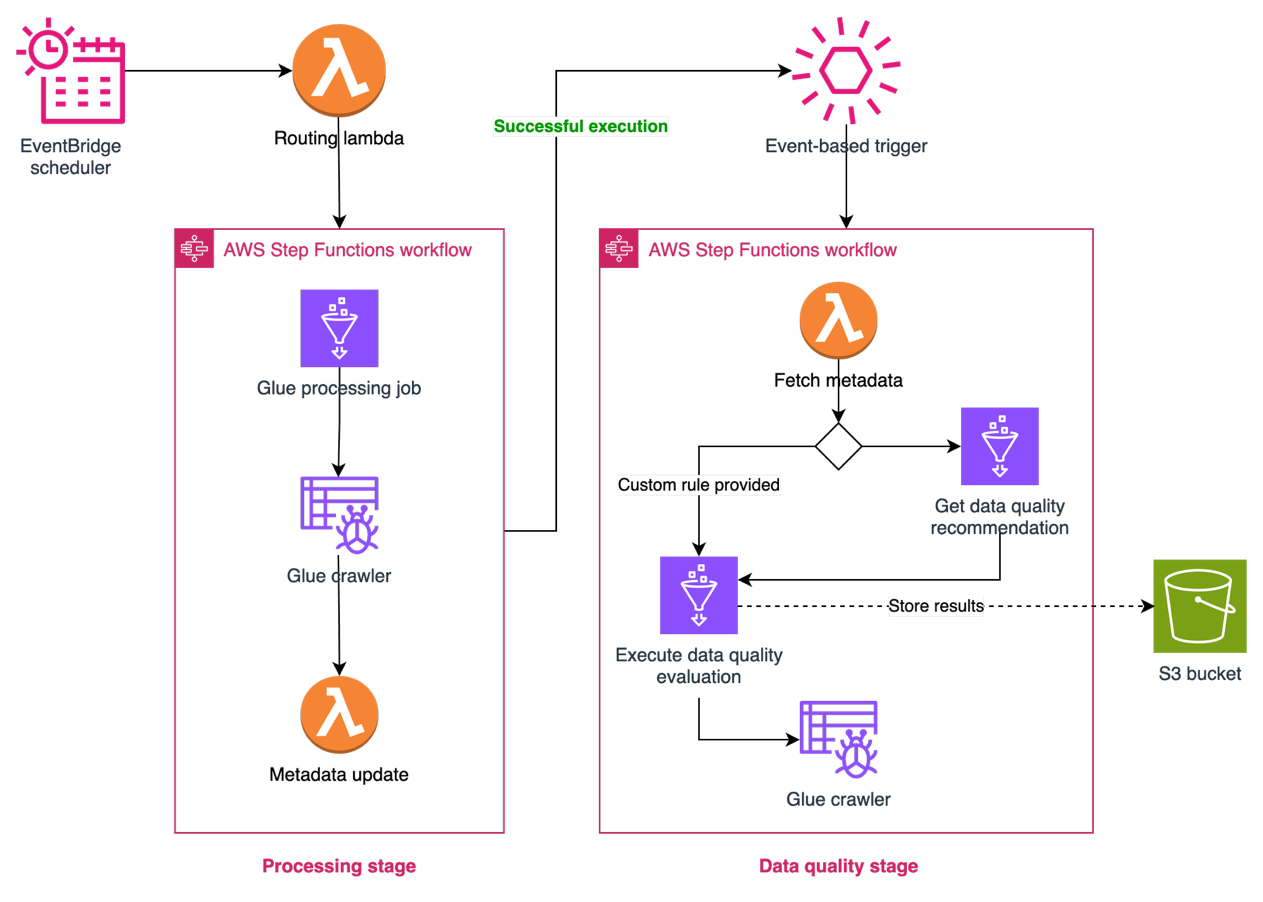 The integration provides data teams with the flexibility to define quality expectations while maintaining consistency in how quality checks are implemented at the pipeline level. The solution logs quality evaluation results, providing visibility into the data quality metrics for each data product. These elements are illustrated in the following figure.