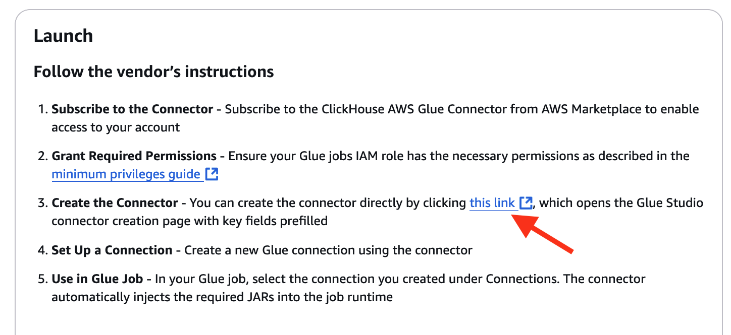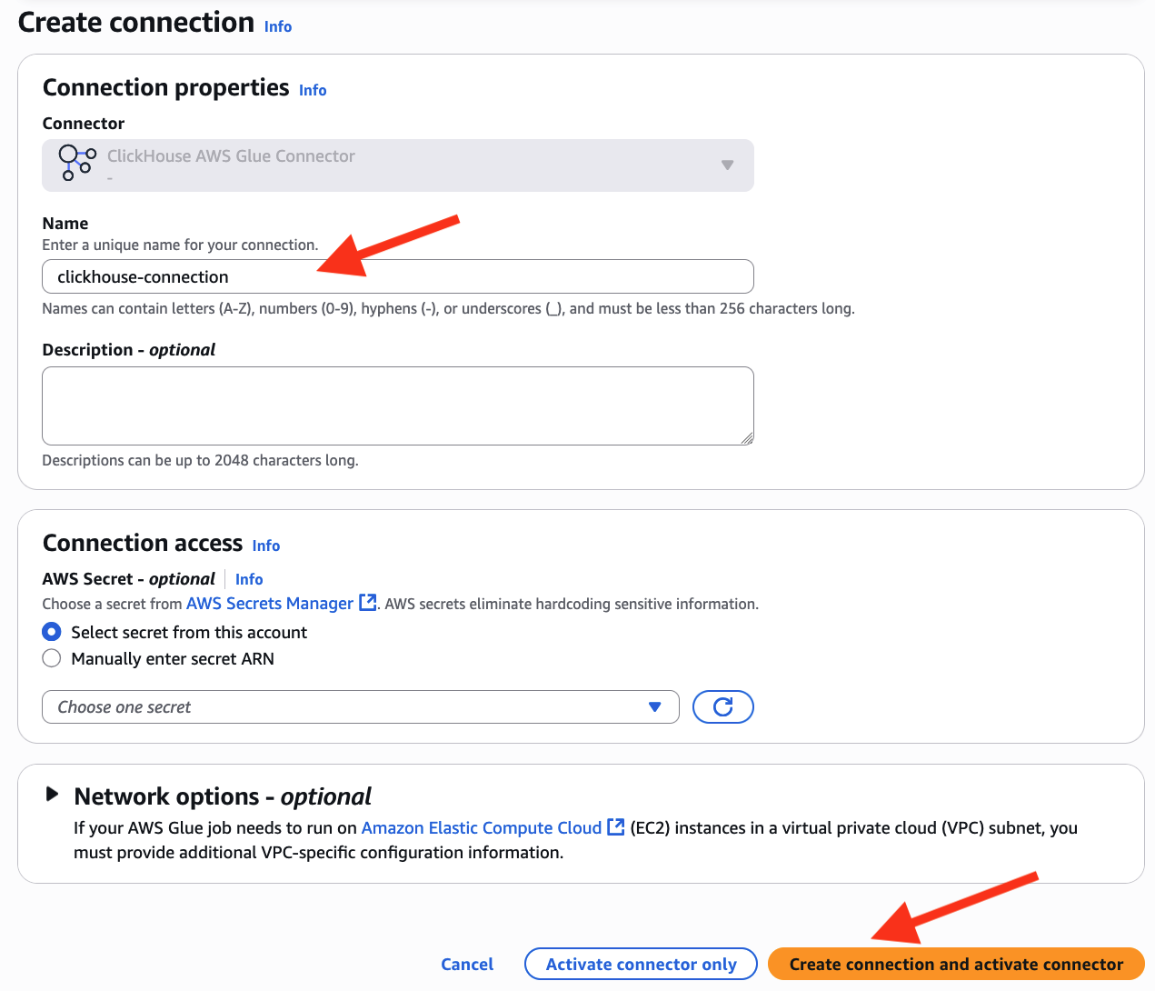 Before using AWS Glue to integrate data into ClickHouse Cloud, you must first set up the ClickHouse environment on AWS. This includes creating and configuring your ClickHouse Cloud on AWS, making sure network access and security groups are properly defined, and verifying that the cluster endpoint is accessible. Once the ClickHouse environment is ready, you can leverage the AWS Glue built-in connector to seamlessly write data into ClickHouse Cloud from sources such as Google Cloud BigQuery. You can follow the next section to complete the setup.