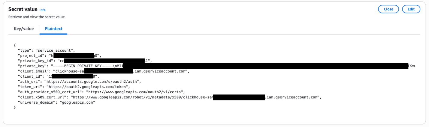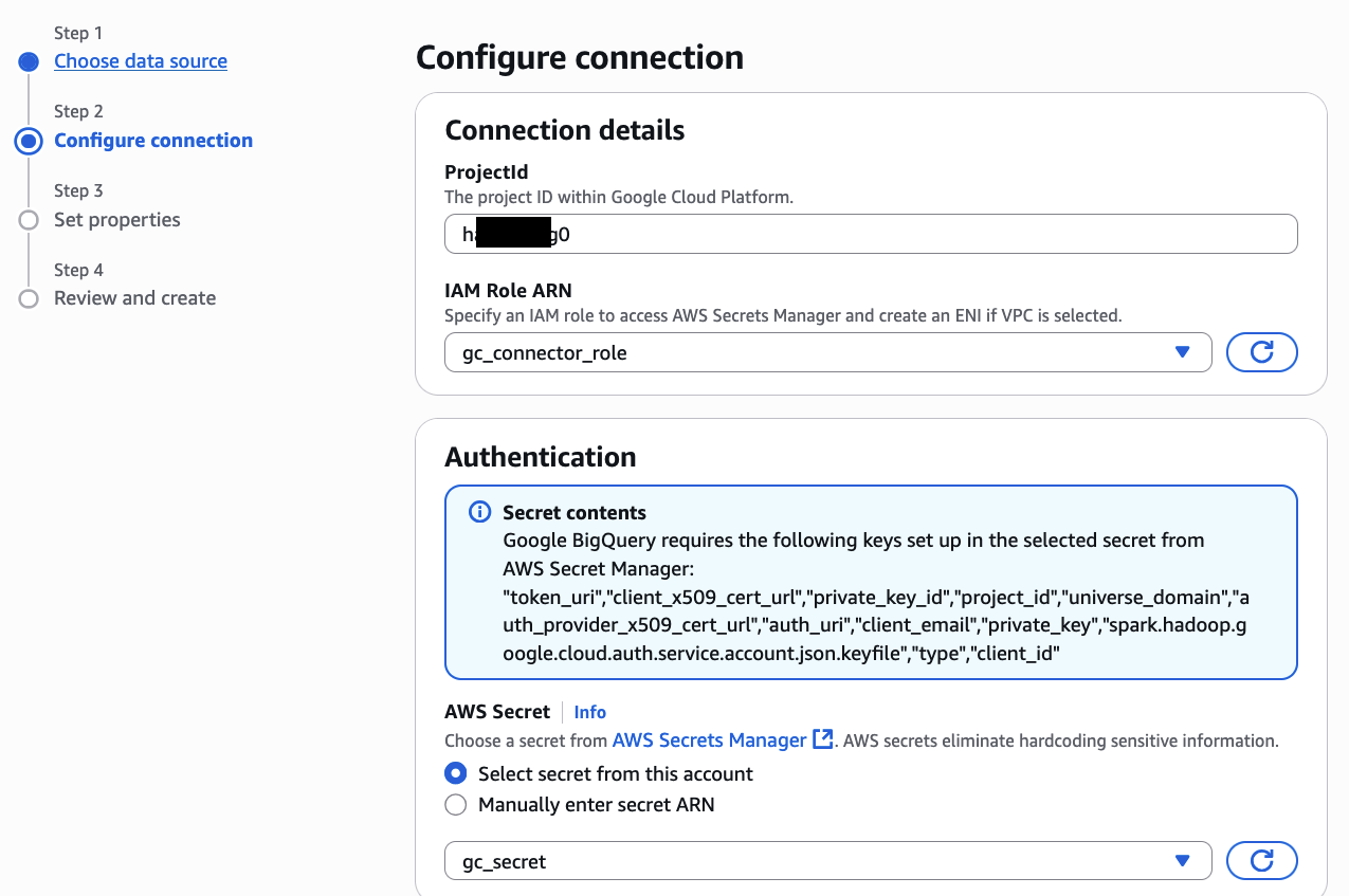 2. Create and Store Google Cloud Service Account Key (JSON format) in AWS Secret Manager, you can find the details in BigQuery connections.