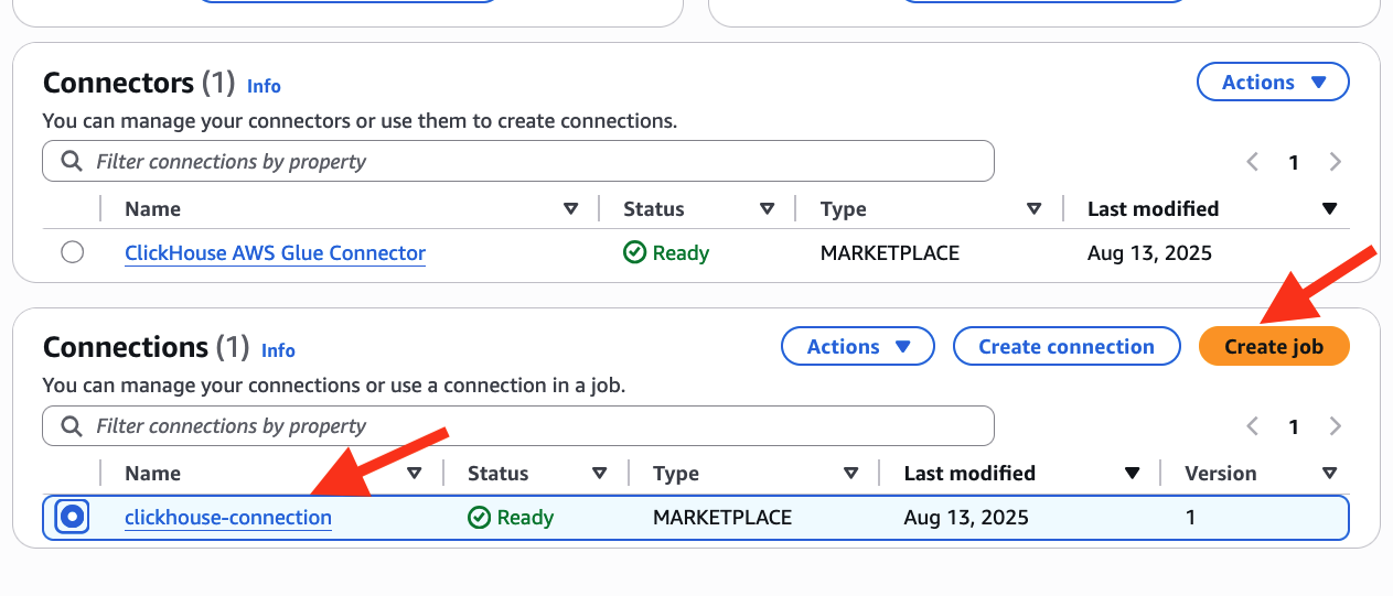 1. On the Connectors view as below, select clickhouse-connection and choose Create job